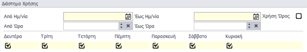 Στα πεδία Από Ημ/νία και Έως Ημ/νία, τα οποία είναι υποχρεωτικά να συμπληρωθούν, ορίζεται το ημερολογιακό διάστημα για το οποίο θα ισχύει η προωθητική ενέργεια. Το πεδίο Χρήση Ώρας, εάν είναι τσεκαρισμένο λαμβάνει υπόψιν την ώρα που έχει οριστεί στα πεδία Από Ημ/νία και Έως Ημ/νία. Στα πεδία Από Ώρα και Έως Ώρα ορίζεται το ωριαίο διάστημα για το οποίο θα ισχύει η προωθητική. Επιπλέον, θα πρέπει να επιλεχτούν (να είναι τσεκαρισμένες) και οι μέρες για τις οποίες θα ισχύει η προωθητική.