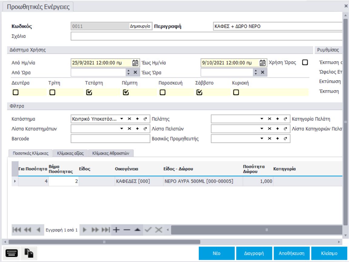 • Για ποσότητα: Ορισμός ποσότητας ειδών για την οποία θα ισχύει η προωθητική