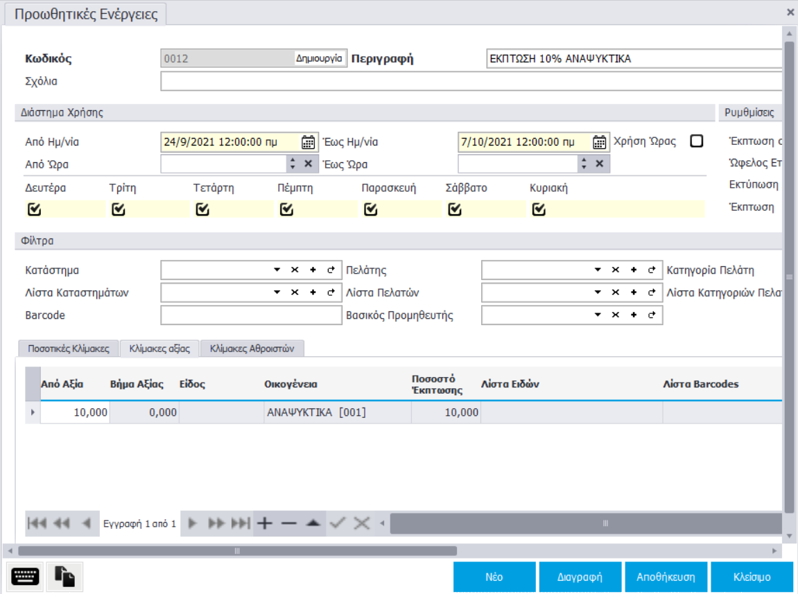 • Κατάστημα: Επιλογή καταστήματος (ή υποκαταστήματος) για το οποίο ισχύει η προωθητική
