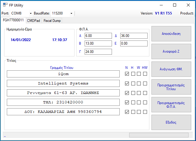 2. Επιλέγετε τη θύρα που είναι συνδεδεμένος ο ΑΔΗΜΕ και πατάτε Σύνδεση. Εφόσον η σύνδεση είναι επιτυχής εμφανίζονται τα στοιχεία του ΑΔΗΜΕ.