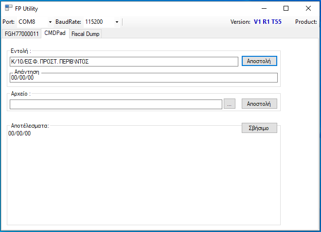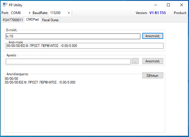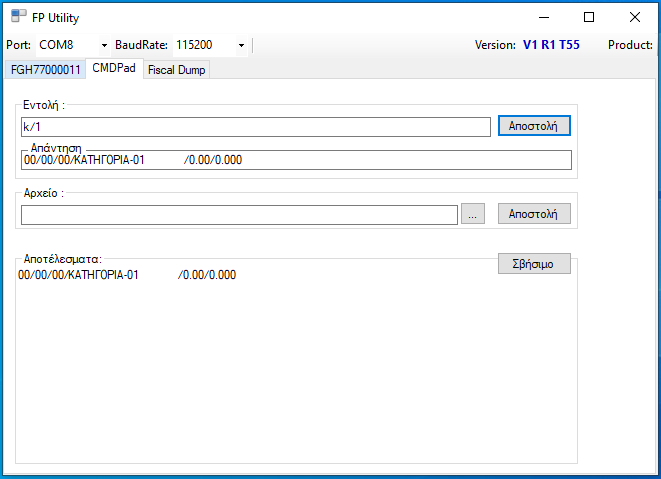 3. Στη καρτέλα CMDPad στο πεδίο «Εντολή», με την εντολή k/1 και πατώντας το κουμπί «Αποστολή», εμφανίζεται η περιγραφή που είναι προγραμματισμένη για την κατηγορία 1. Αντίστοιχα με την εντολή k/2, εμφανίζεται η περιγραφή που είναι προγραμματισμένη για την κατηγορία 2.