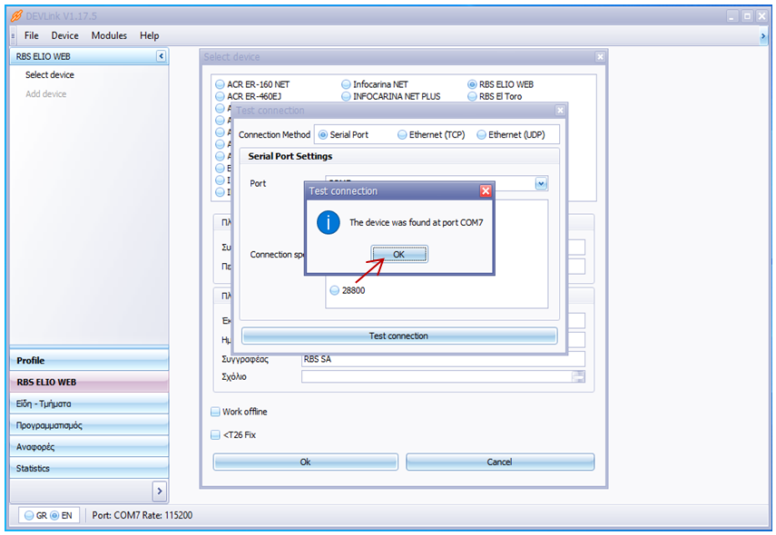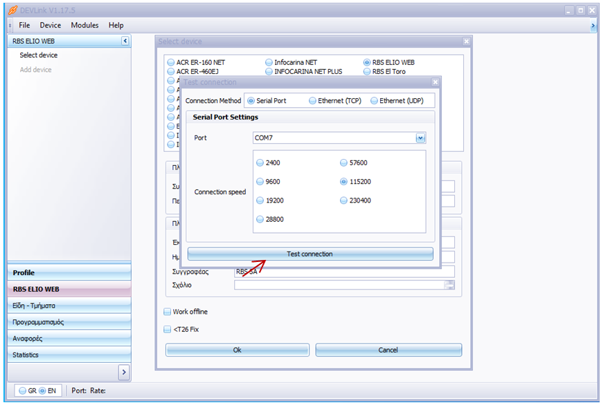 και ελέγχετε εάν η σύνδεση με τη ταμειακή είναι επιτυχής. Σε περίπτωση που δεν είναι ελέγχετε τις ρυθμίσεις παραπάνω.