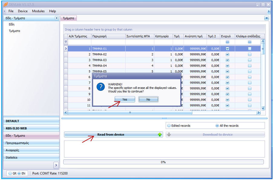 4.  Από το μενού «Είδη – Τμήματα \ Τμήματα», πατάτε Read from device για να διαβάσει το εργαλείο τα υφιστάμενα τμήματα που έχει η ταμειακή. Στην προειδοποίηση που εμφανίζεται πατάτε Yes.