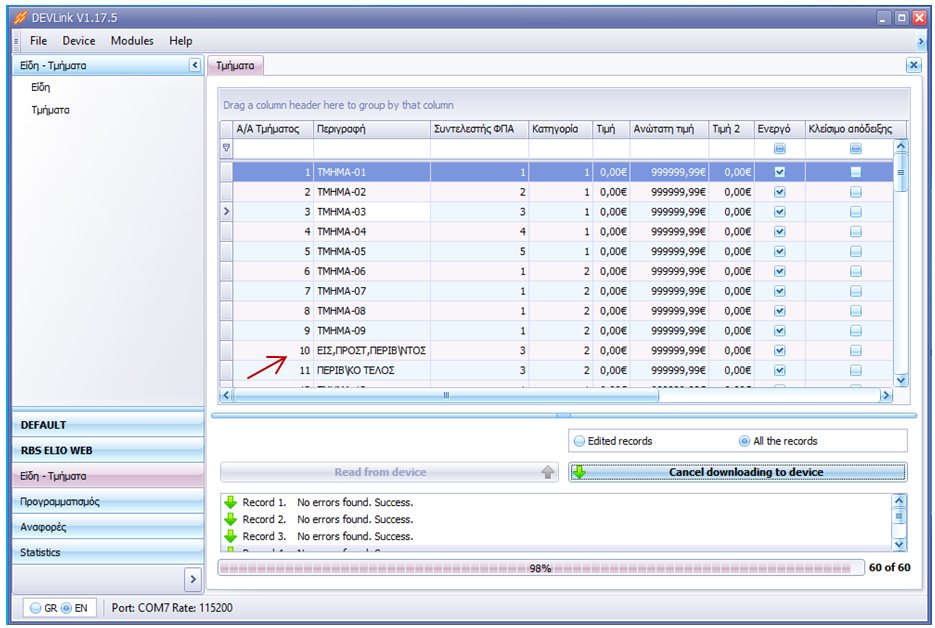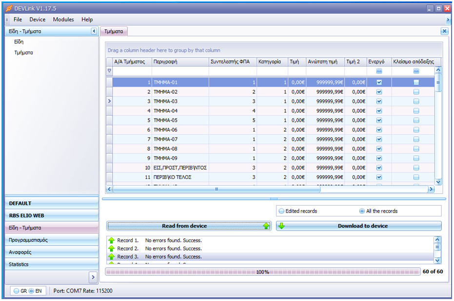 Για τον προγραμματισμό τμημάτων σε ταμειακές χρησιμοποιείται το εργαλείο DevLink. Για οποιαδήποτε αλλαγή στα τμήματα, προϋπόθεση είναι να έχει βγει Ζ και η εφαρμογή RetailStudio να είναι κλειστή.