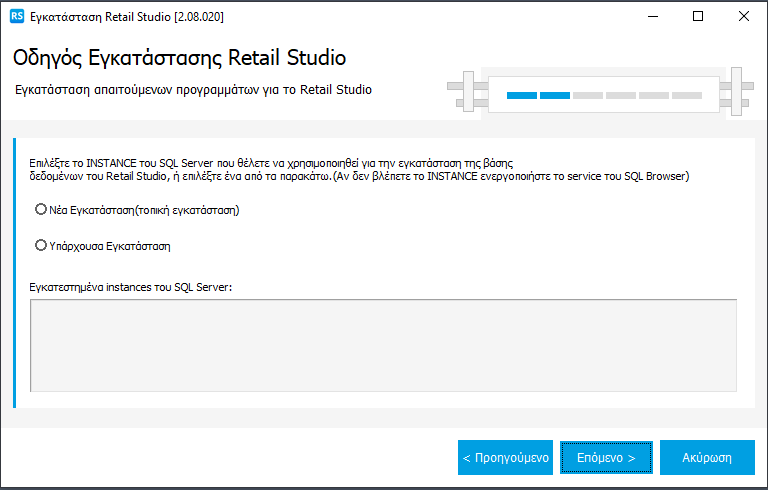 Στην δεύτερη οθόνη μπορείτε να επιλέξετε το INSTANCE του SQL Server στο οποίο θα δημιουργηθεί η βάση δεδομένων της εφαρμογής. Για την δημιουργία νέου instance υπάρχει η επιλογή Νέα Εγκατάσταση (τοπική εγκατάσταση), ενώ για να δημιουργηθεί η βάση δεδομένων σε κάποιο υπάρχον instance υπάρχει η επιλογή Υπάρχουσα Εγκατάσταση.