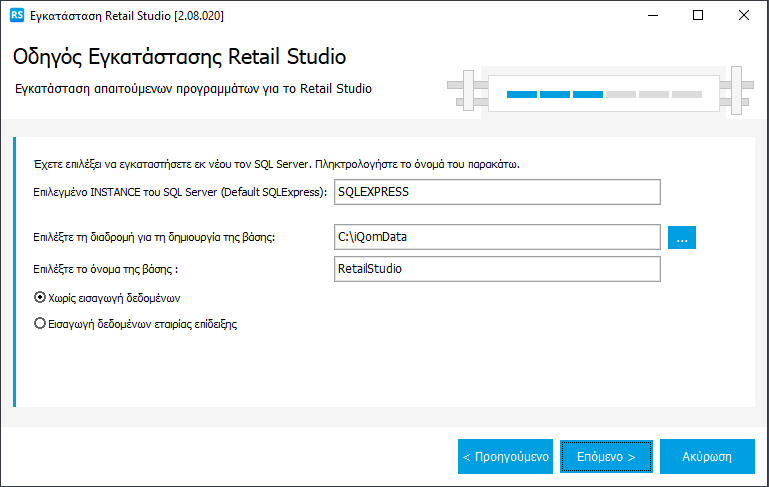 Αν επιλέξετε Νέα Εγκατάσταση στο επόμενο βήμα πρέπει να συμπληρωθούν το όνομα του instance που θα δημιουργηθεί (προεπιλεγμένο είναι το SQLEXPRESS), η διαδρομή για τη δημιουργία βάσης και το όνομα της βάσης.