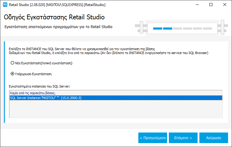 Με την επιλογή της Υπάρχουσας εγκατάστασης και εφόσον είναι ενεργοποιημένος ο SQL Browser εμφανίζονται όλα τα διαθέσιμα εγκατεστημένα instances. Αφού επιλέξετε κάποιο από αυτά πατάτε το κουμπί Επόμενο.