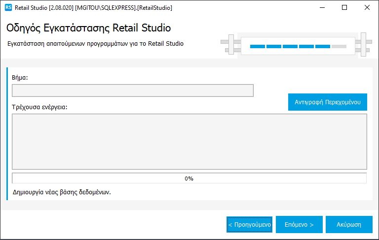 Στο επόμενο βήματα γίνεται η δημιουργία της βάσης. Για να ξεκινήσει η διαδικασία πατάτε Επόμενο. Αφού ολοκληρωθεί πατάτε Τέλος.